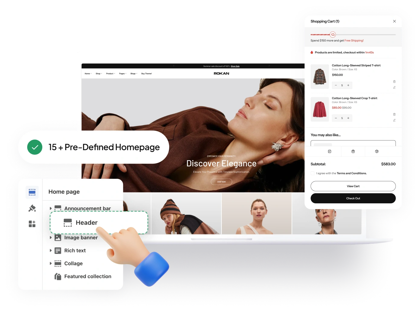 With 40+ section everywhere, well thought-out options, you can built your store in a few hours. Whatever you have an idea to sell. Let Rokan make it come true!
